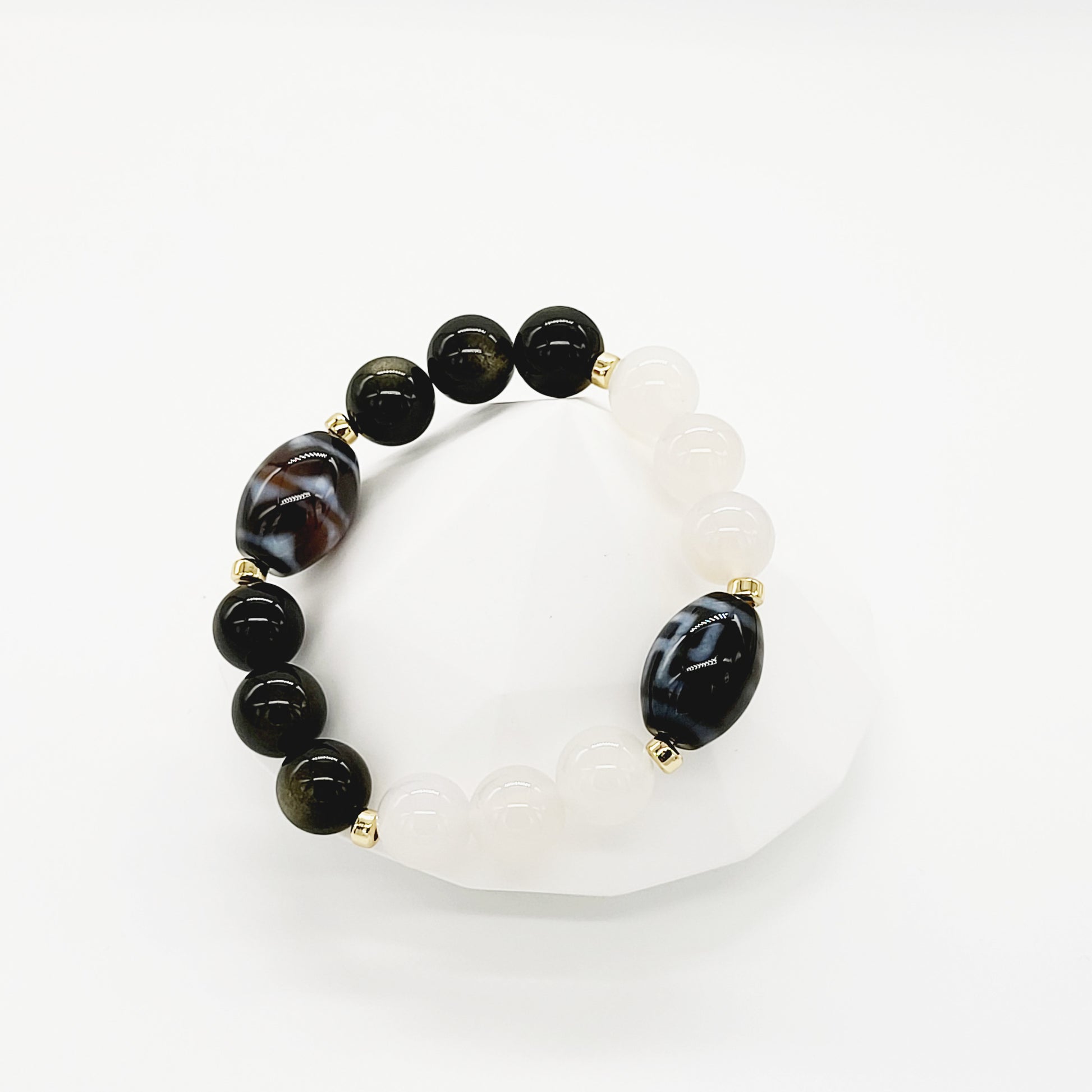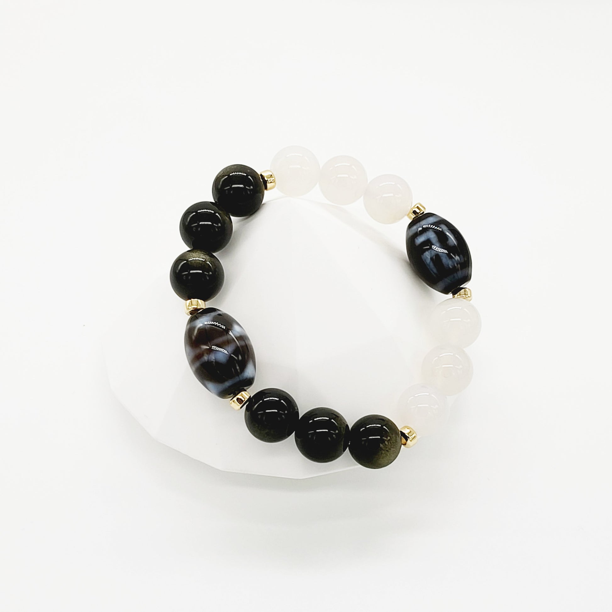 To boost up the benefits, we used Obsidian as it draws out mental stress, tension, brings clarity to the mind, and clears confusion. White agate which will bring you good fortune, help you to find a source of positivity and energy in hard situations.