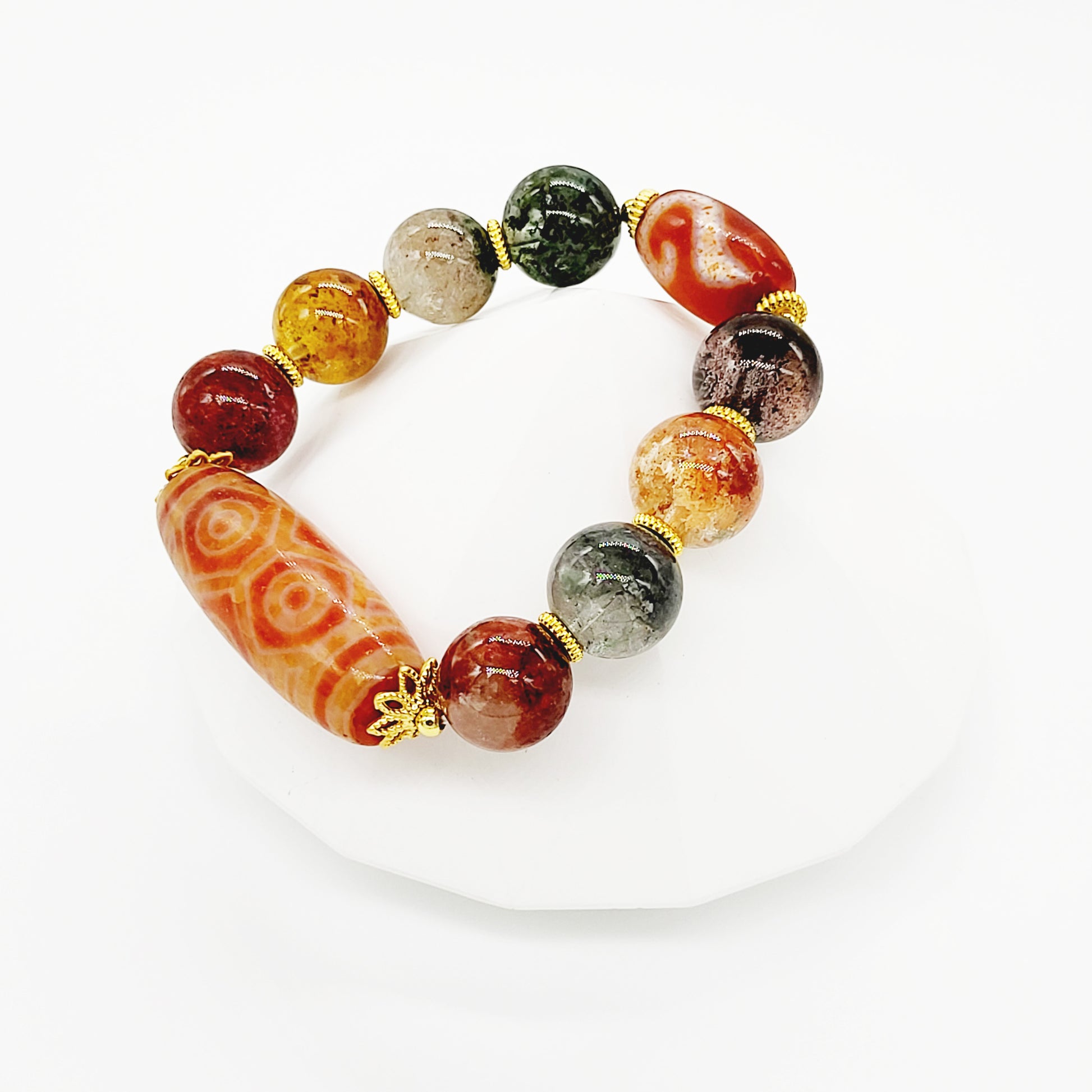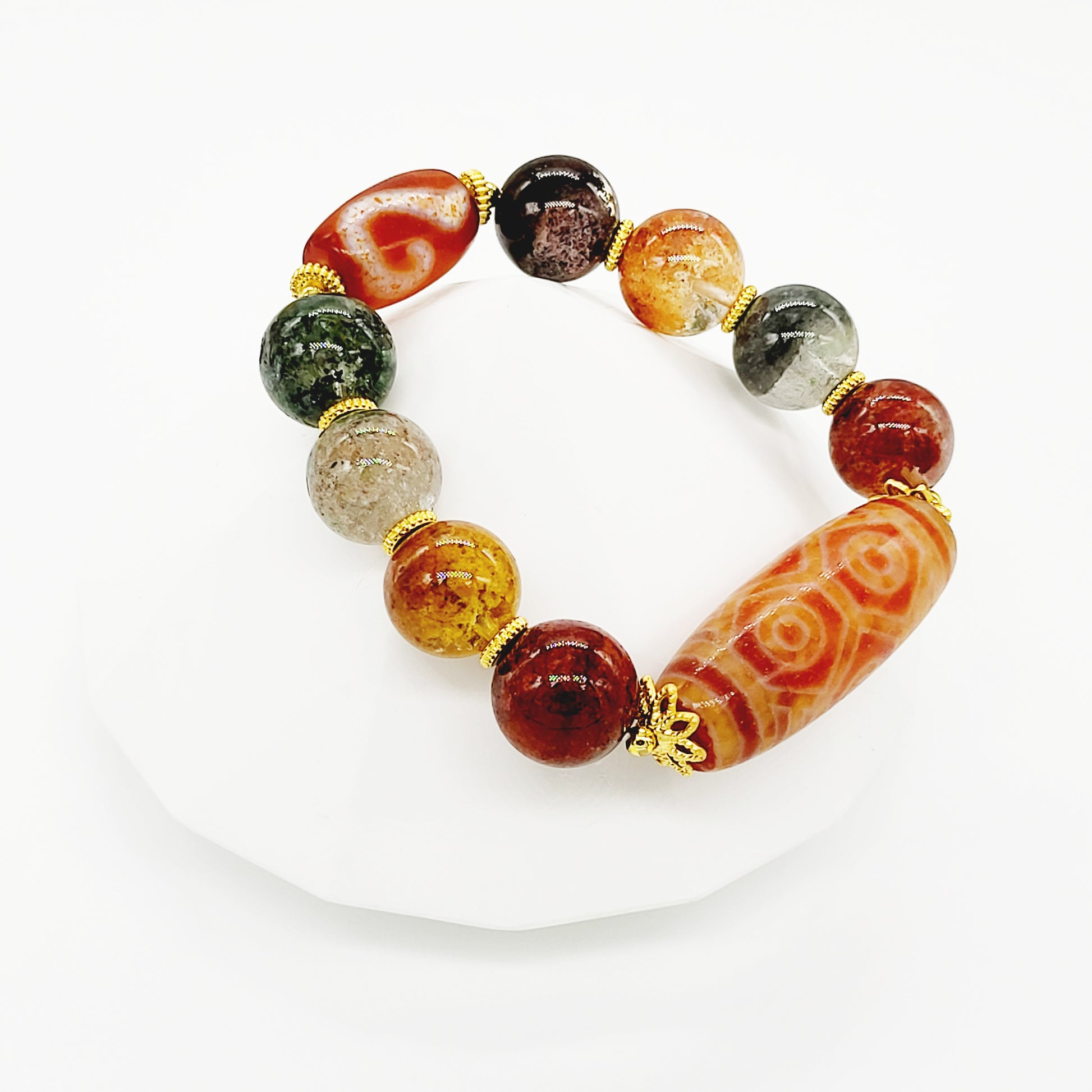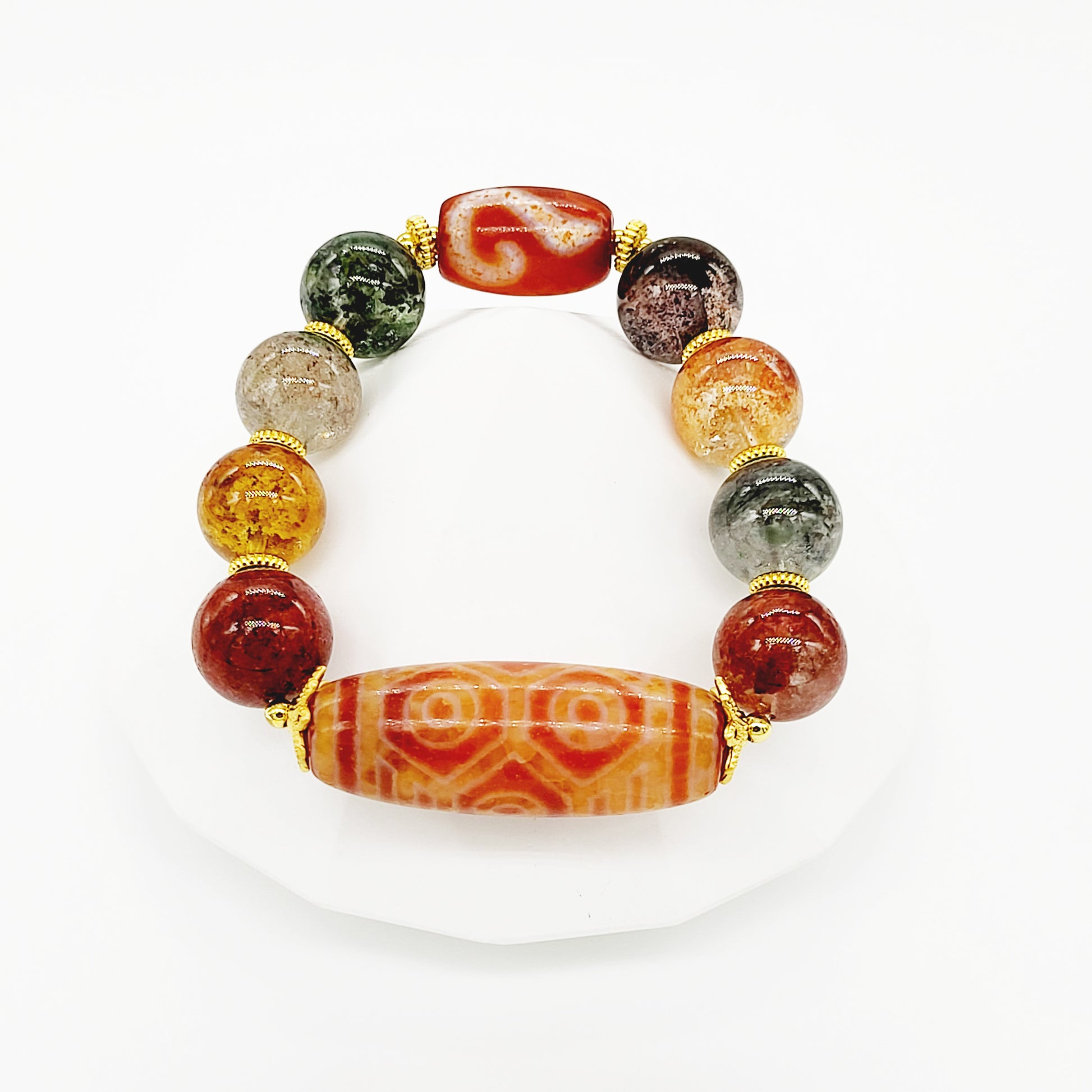 Dragon Veins 6 Eye Dzi helps to keep down six emotions – anger, dismay, mindlessness, aggression, ignorance, and sadness. It helps to obtain health and long life, to accumulate mental and physical strength. This Dzi is also connected to one of the major mantras – “Om Mani Padme Hum”. Working as the talisman of luck the six-eye bead restores emotional strength. Combined with Rare Dragon Veins, it makes this bracelet definitely one unique piece and worth collecting for all Dzi Collectors.