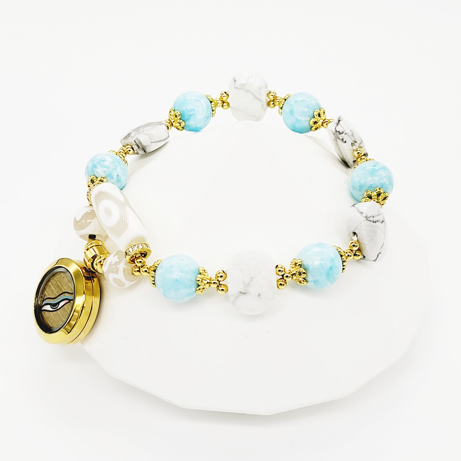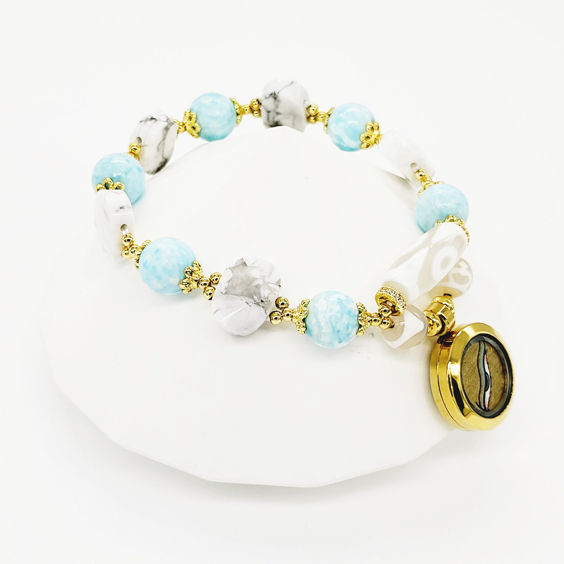 To boost its benefits, we added Larimar and White Turquoise as they help you become more open to love and forgiveness, and release patterns of self-sabotage. Also helps stress-related imbalances, general anxiety, and panic attack.